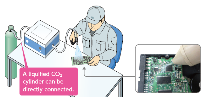 without damaging boards, etc. - Dry ice powder made from liquefied CO2 is jetted out to clean particles and oil and fat content without damaging the objects to be cleaned.